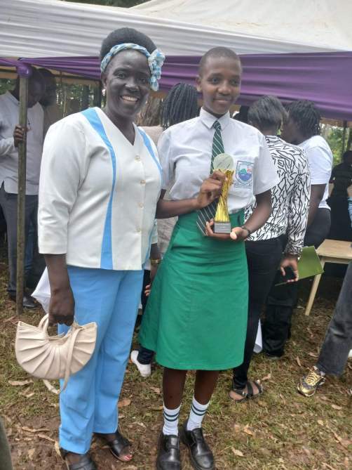Linnet Aluoch Oketch wins a trophy for the best innovation in sustainable Environment Advocacy during the International Day of the girl child held in Homa-Bay Rachuonyo East, Omiro Health Centre. The function was presided by Hon Sarah Malit, the County Gender Youth and Sports.